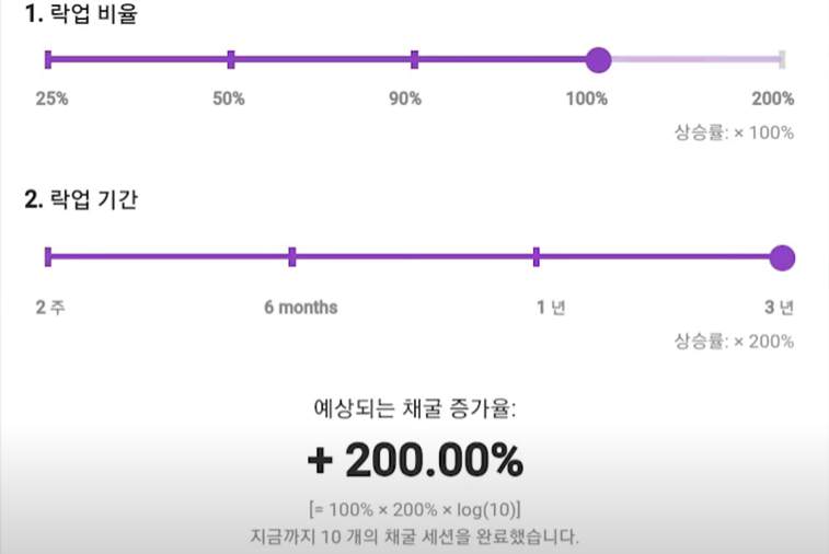 - 비율과 기간이 높을수록 채굴 속도가 크게 증가합니다.