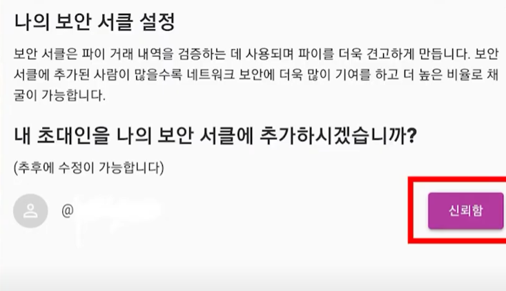 - 내가 신뢰하는 파이코인 사용자 5명을 보안서클에 추가하면 채굴 속도가 100%까지 증가합니다.